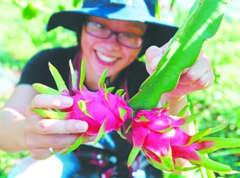 图为近日一位游客在采摘火龙果。 (学军 玲富)